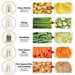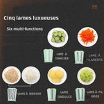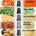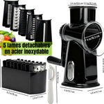 • 🧩 5 tambours interchangeables – Râpe fine, râpe grossière, trancheuse, découpeuse, moulinette.
